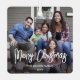 Celebrate the simple joys of the holidays with a custom 2 photo overlay square metal ornament. Pictures and all text on this template are easy to customize and can be different or the same on front and back. It can include any wording, such as Merry Christmas, Happy Holidays, My First Xmas, Best Friends, kids & family names, etc. (IMAGE PLACEMENT TIP: An easy way to position a photo exactly how you want is to crop it before uploading to the Zazzle website.) The black and white design features trendy modern brushed script calligraphy, simple minimalist typography names & year, and two photos of your choice. This unique keepsake adds a stylish touch to Xmas home decorations. Merry Christmas!
