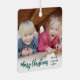 Celebrate the simple joys of the holidays with a custom 2 photo overlay square metal ornament. Pictures and all text on this template are easy to customize and can be different or the same on front and back. It can include any wording, such as Merry Christmas, Happy Holidays, Best Friends, kids & family names, etc. (IMAGE PLACEMENT TIP: An easy way to position a photo exactly how you want is to crop it before uploading to the Zazzle website.) The festive green, white and black and design features chic trendy brushed script calligraphy, simple modern minimalist typography names & year, and two photos of your choice. This unique keepsake adds a stylish touch to Xmas home decorations. Merry Christmas!