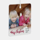 Celebrate the simple joys of the holidays with a custom 2 photo overlay square metal ornament. Pictures and all text on this template are easy to customize and can be different or the same on front and back. It can include any wording, such as Merry Christmas, Happy Holidays, Best Friends, kids & family names, etc. (IMAGE PLACEMENT TIP: An easy way to position a photo exactly how you want is to crop it before uploading to the Zazzle website.) The festive red, white and black and design features chic trendy brushed script calligraphy, simple modern minimalist typography names & year, and two photos of your choice. This unique keepsake adds a stylish touch to Xmas home decorations. Merry Christmas!