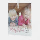 Celebrate the simple joys of the holidays with a script typography photo overlay square glass ornament. The picture and all text on this template are easy to personalize. Customize with any wording, such as Merry Christmas, Happy Holidays, My First Xmas, Best Friends, kids & family names, etc. The festive red, white and black and design features chic trendy handwritten script calligraphy, simple modern minimalist typography names & year, and one photo of your choice. This unique keepsake adds a stylish touch to Xmas home decorations. Merry Christmas!