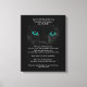 This beautiful apache wedding blessing, which starts with "now you shall feel no rain. with a black cat with turquoise eyes looking at you white text and black background.
