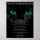 This beautiful apache wedding blessing, which starts with "now you shall feel no rain. with a black cat with turquoise eyes looking at you white text and black background.