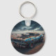 Blue Classic 1969 Chevy Camaro with blower and spots of rust out in the desert during apocalypse.