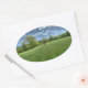 A rich green landscape, with a field of tall grass edged with trees under a deep blue sky full of clouds. A gnarled dead tree stands by itself in the middle of the field.