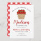 A BUSHEL OF FUN! Apple theme first birthday party invitation with basket of apples and red plaid design.