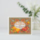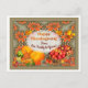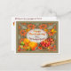 A gorgeous thanksgiving card with an abstract background created from an image of bright orange berries, with additional fall foliage, colourful pumpkins, and a large basket of red apples, other vegetables and fruit.