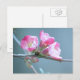 A photograph of an apple tree branch with pink apple blossoms on a blue/grey background.