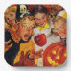 A retro Halloween sticker that shows a funny mid-century image of kids bobbing for apples at a Halloween costume party. One boy is watching his tooth fly off in the apple. "Don't let your sweet tooth get away from you!"