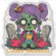 Zombies love apple cider in the fall, makes them feel at home and alive! This zombie is drinking her cider in the cemetery. Gold text.