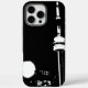 Cool & Classy iPhone 16 rugged case. For busy Toronto sales reps, visitors, office employees, business owners. Toronto Tower with Full Moon. Black and white stencil. Photo.