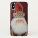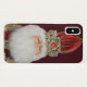 coque iPhone X avec une image de St. Nick avec sa tête bijouée et sa tenue. Il a une longue barbe blanche, et l'arrière - plan est de la canneberge foncée.