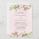 Design features a printed coloured with floral element in shades of blush pink over greenery leaves branch wreath and apple tree blossoms on a light pink watercolor background.. Great for your wedding celebrations!