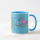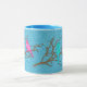 Mug depicting three little birds, perched on a branch, in a digital collage of fractal swirl patterns, against a Japanese swirl patterned background - shades of sky blue, turquoise, fuchsia pink and brown