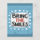 "Bring The Smiles" est un design de texte mignon en bleu avec du texte en noir et rouge, avec une forme d'accent blanc et des points blancs texturés blancs qui l'entourent.