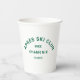 Après Ski Club, winter green ski resort crest paper cups. Personalize with the year of your ski trip, ski resort name and location. Perfect for a group destination ski trip or for an après ski theme party. Designed to match our Après Ski Club Collection.