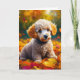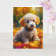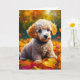 Cute Apricot poodle puppy dog playing in yellow fall leaves greeting card.