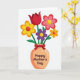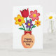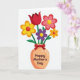 Designed with a simple, friendly look, this card features a bouquet of five stylized flowers arranged in a softly curved apricot-colored vase, creating a gentle, caring mood ❤️. A tall crimson tulip rises near the upper center, its curled petals standing like a steady presence among the other blooms. Around it sit two round yellow flowers with warm orange centers, a rose-pink flower with a sunny yellow middle, and a deep purple flower with a bright yellow center, their close spacing suggesting togetherness. Thin green stems and a few small leaf shapes connect everything, keeping the composition tidy and easy to take in. A scarlet ribbon is tied around the vase’s neck in a neat bow, adding a classic touch of affection. The words “Happy Mother’s Day” appear across the front of the vase in a bold, readable style, standing out clearly against the apricot surface 🌼. The background is plain white, with only light shading on the vase and flowers to define their shapes.