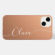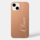 Apricot Shimmer White Elegant Calligraphy Script Custom Personalized Name iPhone 14 Smart Phone Cases features a modern and trendy simple and stylish design with your personalized name in elegant hand written calligraphy script typography on a metallic apricot shimmer background. Designed by ©Evco Studio www.zazzle.com/store/evcostudio