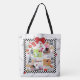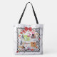 Large all-over-print brushed polyester tote bag with an image of lovely ladies sitting at a café in Paris enjoying a lovely April day in a black and white chequerboard frame on a washed out image of black Eiffel Towers on white. See the entire Cancan Tote Bag collection in the PARTY FAVORS section.