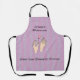 The design is a lavender apron with dotted stripes, and a set of illustrated hands with nail polish, holding a pretty pink flower. Thanks to Pixabay for the hand image. All the words can be changed.