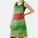 Apron with vibrant, geometric diamond patterns in red, green, and yellow. A smiling individual wears it over a blue shirt, conveying a cheerful tone.