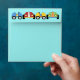 Cute square invitation envelope done in aqua, with graphics of a colourful line of cartoon race cars, on the back flap, and a black and white chequered pattern, on the inside. Personalize the black return address to suit your needs. Perfect finishing touch to our little boys race car birthday party invitations.