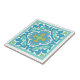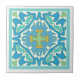 This beautiful tile features an exotic spanish tile design with a beachy blue green kaleidoscope background and orange centre accent. Perfect for relaxing on the patio or around the pool with a cold drink.