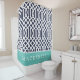 Custom shower curtain featuring a modern trellis print in navy blue, turquoise and white colours. Personalize it with your name or other text along the bottom. Use the design tools to change the background colours to match any bathroom decor. Add your own text and photos to personalize the design and create a one of a kind monogrammed shower curtain.