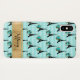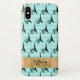 This stylish aqua blue, black, and gold floral Case-Mate Barely There iPhone X Case has a tone on tone aqua blue harlequin diamond pattern with a black Eiffel Tower pattern overlaid on top that have blue flowers trimmed in gold at their base. The case has a wide gold band across the bottom that is personalized with a name or other text.