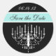 Black and White Chandelier save the date round customizable stickers with an aqua band, easy to customize with your wedding or event date. We have the matching design on wedding invitations, RSVP cards, address labels, thank you notes, and much more.
