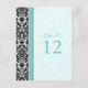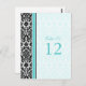 Use the personalize option to change the table number on these elegant aqua or turquoise, black, and white damask table cards. Please NOTE: You MUST change the table number on each card and add one of each number to your cart. If you want to do more extensive changes including changing the font, font colour, or font size use the customize option.