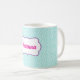 Beautiful aqua blue and lavender purple custom name coffee mug. Makes perfect gift for anyone special, including you! Pink lettering. Customizable.