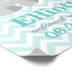 Stylish and sweet nursery art print poster features an adorable little grey newborn baby elephant calf with bright aqua blue shaped splashes, a modern background pattern of aqua blue and white chevron stripes, custom text for the baby's first name and birth date.