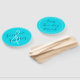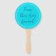 Aqua blue round wedding fans with text on both sides. Names of the couple on one side, with short saying on the other. Text is dark blue and the design is simple. Use at any outdoor wedding for cooling guests, or keeping the bugs away.