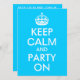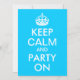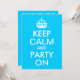 Customizable text areas on an aqua blue and white "Keep Calm and Party On" parody for a birthday party.