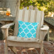 Aqua Blue quatrefoil ogee Moroccan trellis pattern outdoor pillow. Made in the USA. UV and mildew resistant garden or patio pillows in with modern designs in bright summer colours. Available in 16 or 20 inch square and 13 by 21 rectangular sizes. Insert included. (Also available as an interior couch or sofa throw pillow, just select cotton or polyester from the Fabric tab).