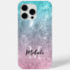 Aqua blue Pink ombre abstract Monogram iPhone 15 Case. Personalize with your custom initial and name. Sea pink viridian green ombre abstract galaxy trendy design. Abstract digital galaxy with sea pink and viridian green ombre colours from coral collection.
