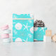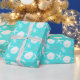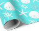 Beautiful coastal Christmas wrapping paper features a pattern of starfish, sand dollars, and glitter coral in an aqua and white colour scheme.