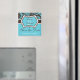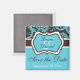 This aqua blue, brown, and white damask save the date magnet matches the wedding invitation shown below. The text is all customizable.
