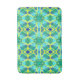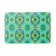 Bath mat in a tie dye pattern in shades of cobalt blue, green and yellow with an aqua / seaglass green background