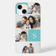 Chic photo collage phone case features five of your favourite photos in a gridded layout with contrasting turquoise aqua squares. Personalize with your single initial monogram in classic white lettering.