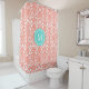Customizable monogram classic elegant floral damask pattern shower curtain in peach coral pink, light turquoise aqua blue and white.