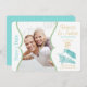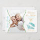 Carton de save the date à thème plage aqua et or avec coquillage et texte doré.