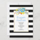 Beautiful modern and chic floral wedding invitation showcasing lovely aqua blue and yellow flowers and leaves, a border made of black and white stripes and your text on a white frame. The back includes a striped pattern in black and white.