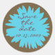 A turquoise gerbera flower is silhouetted against a brown polka-dot background. "Save the date overprints the flower. Personalize the sticker with your event date. Available in alternate colours with matching products.