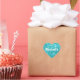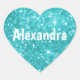 An aqua heart-shaped sticker featuring a pretty glittery pattern with a child's name on - ideal for kid's birthday parties or when a fancy name tag is required, for games, in the school room, children's craft activities and more. The name can be customized to suit - or removed altogether if desired.