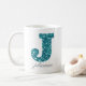 An aqua sparkly abstract polkadot pattern monogram letter J with your name underneath in a grey script.