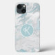 Elegant iPhone case done in a white and aqua blue marbled pattern. An aquamarine circle text area, in the middle of the case, has a single white script monogram. Personalize the one letter monogram, for yourself or as a great gift idea for her.