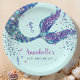 Add a touch of enchantment to your little mermaid's special day with our customizable mermaid theme birthday paper plates! These plates feature a stunning aqua background with a stylish blue-purple glitter print mermaid tail and seahorses that will transport your guests to an underwater paradise. These plates are fully customizable – simply add your child's name and age to make their birthday catered to perfection.