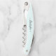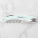 Create your own custom, personalized, classy modern elegant black calligraphy typography script font monogrammed on light aqua blue background, chic stylish cool contoured ergonomic handle bottle opener featuring a stainless steel foil cutter blade, a beer bottle cap opener, and a steel spiral corkscrew wine bottle opener. Simply type in your name / family name, to customize. Makes a great gift for birthday, christmas, holidays, wedding, fathers day, first home / housewarming gift, grandparents day, family reunions, friendship day, special tastings, milestone birthdays, and more, for your loved ones, mom, dad, girlfriend, boyfriend, husband, wife, couples, newlyweds, corporate clients, employees, boss, new parents, beer lovers, wine connoisseurs, men, women, him, her, friends and family.